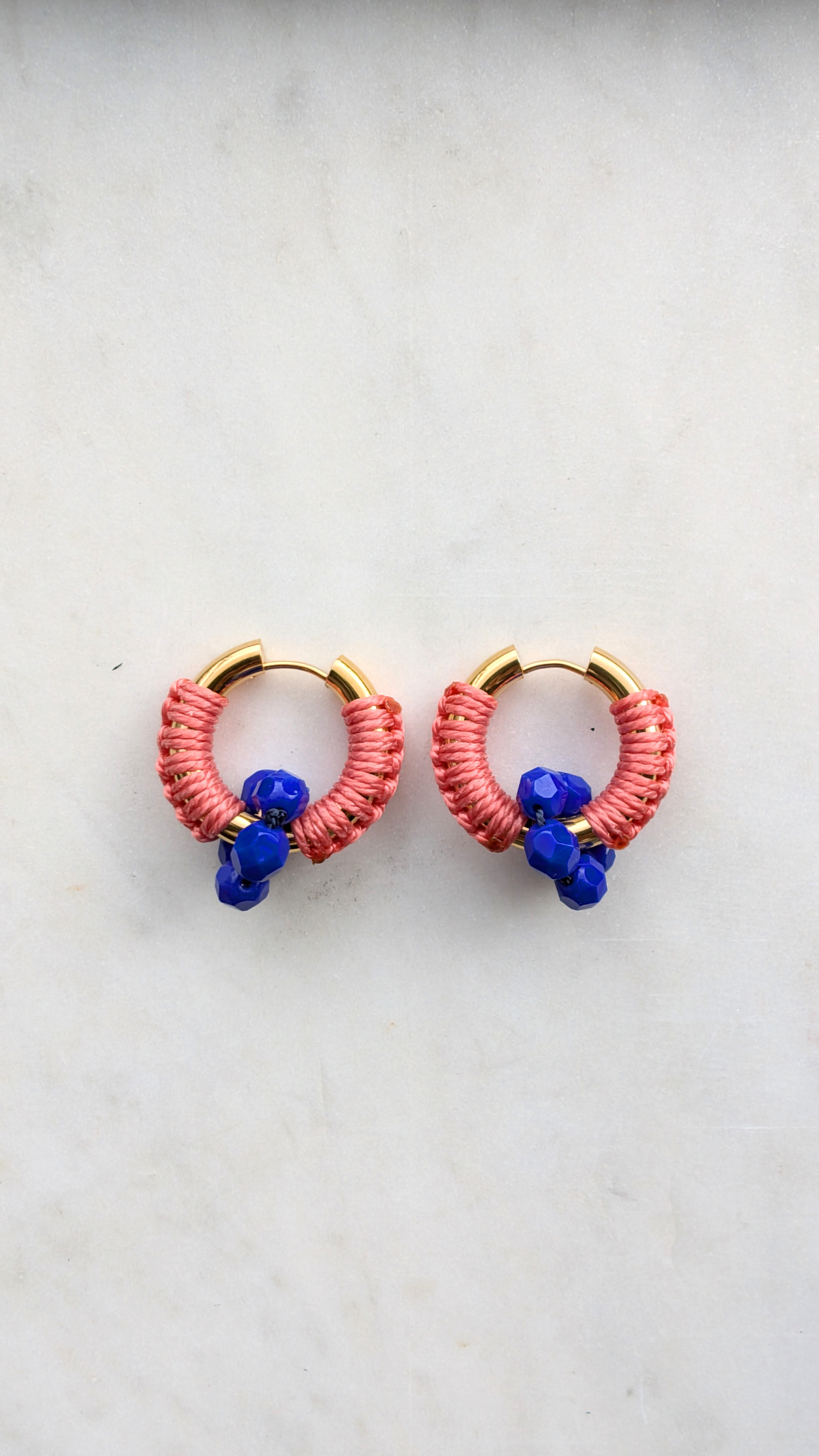 Gold hoop earrings with Pinkn cord and Blue beads.